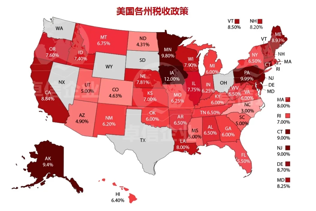 綜合稅率較低的州為:懷俄明州、華盛頓州、內(nèi)華達(dá)州、科羅拉多州、俄勒岡州、得克薩斯州和特拉華州
