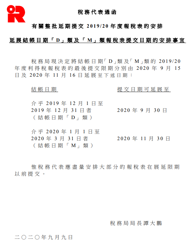 9月9日,香港稅務(wù)局發(fā)出關(guān)于《有關(guān)整批延期提交2019/20年度報(bào)稅表的安排》通知,稅務(wù)局決定延展結(jié)賬日期「D」類及「M」類報(bào)稅表提交期限,由最后提交期限的2020年9月15日改為2020年9月30日。