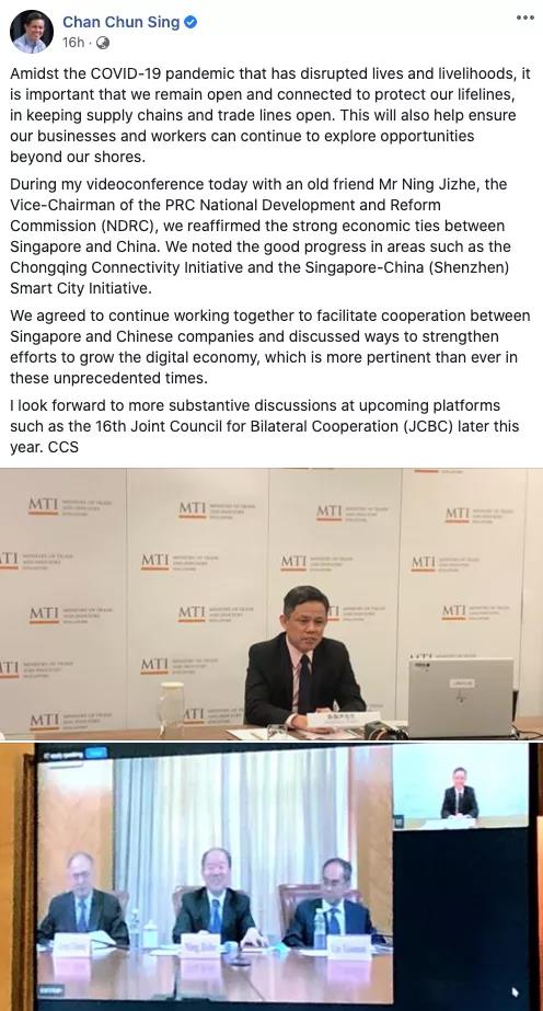 在中國的一帶一路倡議、政府與政府的項目和中新(重慶)互聯互通倡議這一系列新的國際陸海貿易走廊框架下,陳振聲部長肯定了新加坡和中國深厚的經濟聯系。陳振聲部長在視頻會議結束后的臉書發(fā)帖表示,新加坡保持開放和連接,從而保護生命線,保持供應鏈和貿易線的開放,是非常重要的。這也將有助于確保新加坡的企業(yè)和工人能夠繼續(xù)探索海外機會。