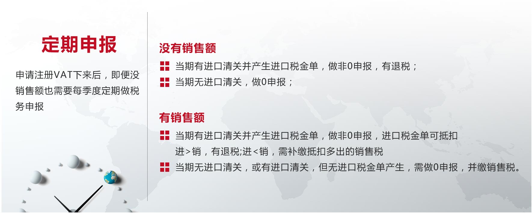 a. 申請(qǐng)注冊(cè)VAT下來(lái)后,即便沒(méi)銷(xiāo)售額,也需要每季度定期做稅務(wù)申報(bào),可選擇由代理代為申報(bào)或自行申報(bào);